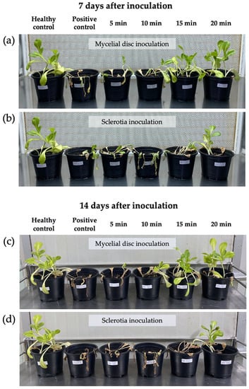 Fungal growth from sclerotia inoculation at 7 days after inoculation was observed as white mycelial growth from sclerotia of the positive control (all lettuce plants died) and treatments involving exposure to the DBD plasma for 5 and 10 min (some lettuce plants had rotted and collapsed), while mycelia from treatments involving exposure to the DBD plasma for 15 and 20 min had slight growth (Figure 6b). At 14 days after inoculation, mycelia from treatments involving exposure to the DBD plasma for 15 and 20 min demonstrated obvious growth (Figure 6b). The results indicate that DBD plasma exposure for over 15 min delays mycelial growth from sclerotia and reduces the disease incidence and disease severity in inoculated plants.