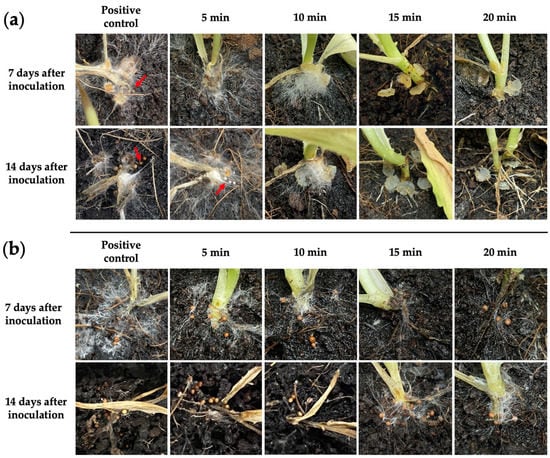 Characteristics and growth of mycelial discs and sclerotia, which were inoculated to lettuce after exposure to the DBD plasma at 5, 10, 15, and 20 min, photographed at 7 and 14 days after (a) mycelial disc inoculation (the formation of sclerotia is indicated by red arrows) and (b) sclerotia inoculation.