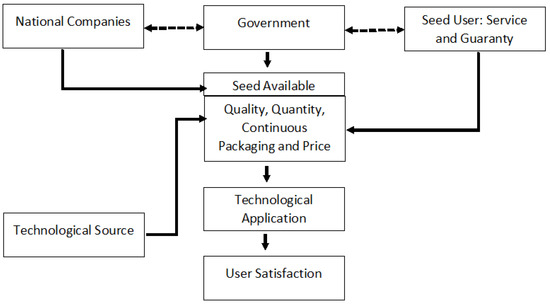 To maintain farmer satisfaction in the transitional zone, 12 attributes that must be maintained are productivity yields that match those of multinational seeds because they are supported by a good cob appearance. Then, a beneficial feature in the transitional sector is that the peak harvest is different from the harvest in the east and west sectors, so prices are more stable and relatively high. When the survey was conducted, the price reached IDR 4300/kg at the farm level. This means that it can potentially compete, but procedurally, the provision of national hybrid maize NSV seeds still requires improvement [76]. As a result, they intend to improve the seed supply system because seed quality is directly related to the results achieved [93,94]. This study is consistent with our previous findings, that the factors that influence farmers adopting new varieties are the agronomic potential and institutional means of production. The agronomic characteristics that are prioritized by farmers in choosing new varieties are high productivity, disease resistance, drought resistance, heat stress, early maturity, and marketability [52,53]. Related studies have shown that agroecological suitability, and also the availability and ease of access to seeds, have a substantial impact on farmer adoption rates [95]. As a result, efforts are needed to strengthen ties with institutions because strong institutions can facilitate the use of modern technology, encourage openness and cooperation with input providers, maintain communication, protect consumers, and regulate administrative and financial governance, rendering it easier to obtain government support [96].