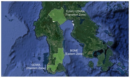 Study site by zones in South Sulawesi: Bone (eastern zone), Gowa (western zone) and Luwu Utara (transition zone).