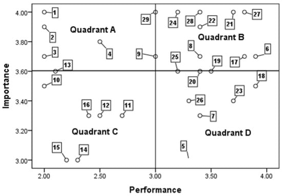 - Quadrant C: Attributes with low farmer expectations and low performance are ignored because they do not affect farmer satisfaction.