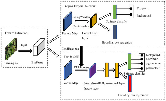 The Faster R-CNN structure is shown in Figure 3, which consists of three parts: feature extraction, RPN, and Faster-CNN. The main steps for soybean weed identification at the seedling stage based on the optimized Faster R-CNN are as follows: