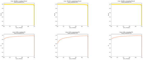 Although the weed identification network proposed in this paper can be more effective than traditional target detection algorithms in identifying weeds in soybean fields in their natural state, some problems still require further research. The weed species in this paper include only grassy weeds and broadleaf weeds. Future studies will be more detailed regarding specific weed species rather than broad weed categories. Secondly, the data used in this study were collected at a small identification scale, and future studies will focus on considering data collected by unmanned aerial vehicles (UAVs). Finally, this study demonstrates the practicality of using attention mechanisms to optimize the network structure. Nevertheless, excellent methods for target detection continue to develop, such as receptive field block (RFB) [41], and spatial pyramid pooling (SPP) [42], and some researchers are now considering how to integrate these advanced methods with their networks and thus improve the speed and accuracy of detection, which is worthy of further exploration.
