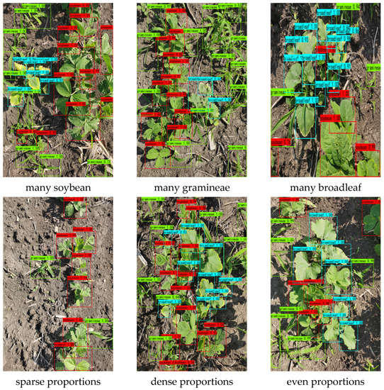 Identification results of soybean and weed with different growth states and ratios. Note: The red, green, and blue detection boxes in the figure are the detected soybean, grass weed, and broadleaf weed, respectively.