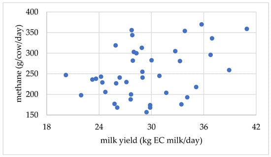 All differences in milk composition or its relationship with methane emissions mentioned here or in the discussion were statistically significant (p < 0.05), unless stated otherwise. As reported by Loza et al. [], milk yield and EC milk yield were slightly but significantly higher for the diverse pasture compared with grass/clover (24.9 and 30.3 vs. 23.4 and 29.4 kg/cow/day, respectively), as was the yield of milk fat (1.41 vs. 1.38 kg/cow/day), despite a lower fat content (5.66 vs. 5.92%).