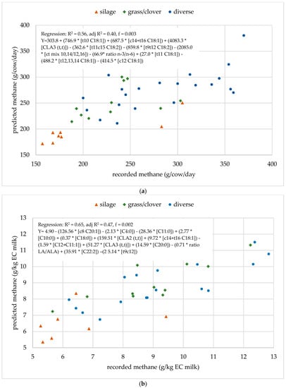 - Methane (g/kg EC milk) = 4.90 − (126.56 × [c8 C20:1]) − (2.13 × [C4:0]) − (28.36 × [C11:0]) + (2.77 × [C10:0]) + (0.37 × [C18:0]) + (159.51 × [CLA2 (t, t)] + (9.72 × [c14 + t16 C18:1]) − (1.59 × [C12 + C11:1]) + (51.27 × [CLA3 (t, t)]) + (14.59 × [C20:0]) − (0.71 × ratio LA/ALA) + (35.91 × [C22:2]) –(2 5.14 × [t9c12]). R2 = 0.65, adjusted R2 = 0.47, f = 0.002.