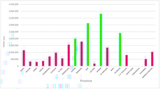 Furthermore, the Bioenergy Atlas of Ecuador, developed in 2015, addressed the energy generation potential of the main agricultural residues [28]. A total gross energy production of 199,057.23 TJ/year was estimated. The highest residue-based bioenergy potential comes from the following commodities: palm oil, banana, rice, cocoa, corn, and plantain. On the other hand, the energy potential from livestock waste was estimated to be 73.78 TJ/year [28].