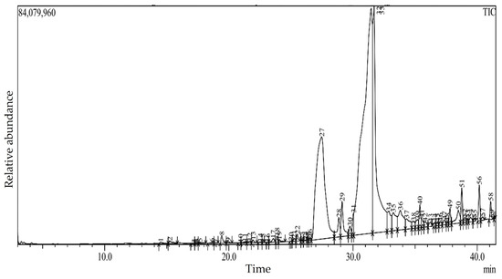A total of 59 constituents were identified from a bitter apple seed, of which seven have significant insecticidal properties: (i) 9,12-octadecadienoic acid (Z,Z)-, methyl ester; (ii) dotriacontance; (iii) 6-octadecenoic acid, methyl ester; (iv) octadecanoic acid; (v) 9, 12-octadecadienoic acid (Z,Z)-; (vi) hexatriacontane; and (vii) n-hexadecanoic acid (Table 1, Figure 3). The highest peak (23.49%) was found for 9, 12-octadecadienoic acid (Z,Z), which has antimicrobial activity and insecticide and miticide properties, followed by octadecanoic acid (23.30%), which has insecticide and miticide properties.