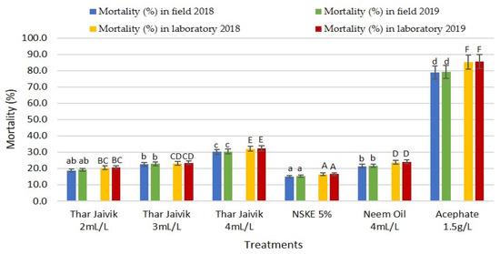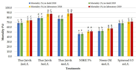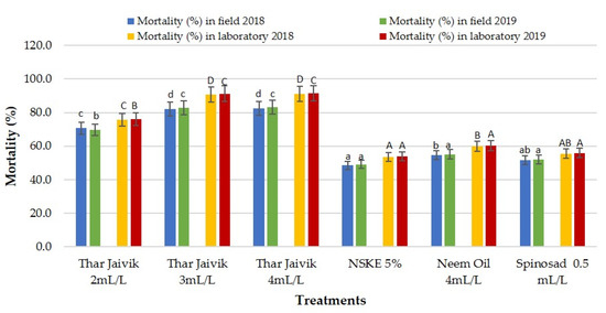 Efficacy of different concentrations of “Thar Jaivik 41 EC” and other biopesticides against H. armigera on cucurbits during 2018 and 2019 (mortality (%) mean of 1 and 3 days after application). NSKE: neem seed kernel extract. Different lowercase letters and uppercase letters indicate significant differences in treatments within field and laboratory conditions, respectively.