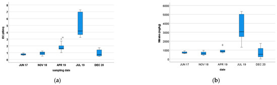 With SAR values, always less than 2.99, there is no risk regarding SAR (Table 5); hence, soil permeability is not expected to be affected with the proposed water and soil management. Finally, at the end of the experiment, the contents of fertility parameters such as OM and Ntot, and of nutrients such as P, K, Fe, and Zn increased in soil, while precautionary parameters such as EC (Figure 1a), nitrate (Figure 1b), and Na returned to the initial values. Only B, which was not lixiviated from soil during the rainy season, had to be carefully monitored, although its value of 1.8 mg·kg−1 did not come close to the value considered hazardous, i.e., 5 mg·kg−1 [26].