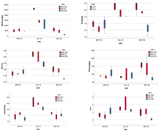 Regarding treatments, the soils irrigated with RWSDI presented significantly higher EC (Table 4) and nitrate, N tot, and B contents (Figure 2) than CWSDI, while the RWDI soils were no different than the other two treatments. Lastly, when comparing treatments per date, the soils irrigated by RWSDI had the significantly highest EC contents in Jul 2019 and B in Dec 2020 (Table 4, different letters). The same tendency of having higher nitrate, Na, and B contents in the 0.07 m topsoil, compared to 0.07–0.2 m (Table S3), was observed for both the treatments irrigated by SDI (RWSDI and CWSDI). Conversely, lower contents of the aforementioned parameters were obtained from topsoil at depth by DI. Furthermore, as expected, the RW-irrigated soils had higher values for the abovementioned soil parameters than the CW-irrigated ones.