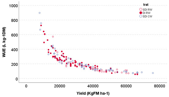 Figure 3 depicts the curvilinear relation between irrigation WUE (L·kg−1 dry matter) and yield (kg FM·ha−1), which is valid for all treatments. It shows how many results had a WUE < 200 L·kg−1 DM, and that it was not easy to obtain WUE values below 100 L·kg−1 DM.