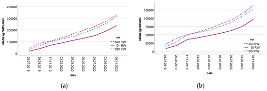 Crop yield and dry matter per harvest were analyzed by a multivariate analysis of variance using the generalized linear model, including harvest date, treatment (RWSDI, RWDI, and CWSDI), and their interactions. Levene’s test was used to analyze the forage data, and separation subsets were tested by considering p = 0.05 with Tukey’s and Games–Howell tests. Lastly, the nonparametric Kruskal–Wallis test analyzed the effect of treatments.