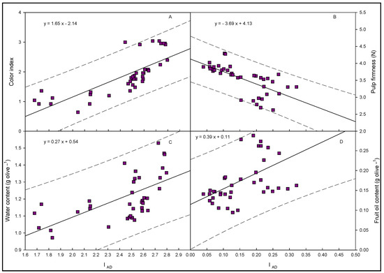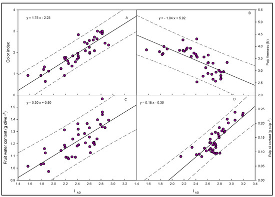The results of regression analysis between IAD measured by Standard DA-Meter® and the olive ripening parameters are reported in Figure 2, with the prediction intervals represented by the upper and lower lines and the regression line in black.