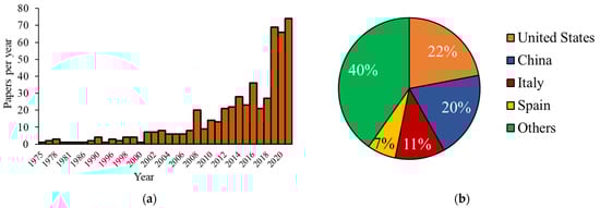 (a) Number of papers and (b) distribution by country of papers published from 1975 to 2021 on biodegradable mulches. Source: Scopus®.