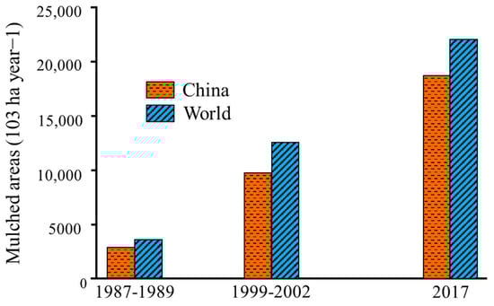 Mulched areas in China and in the world over the 1987–2017 period. Sources: Jensen and Malter [14]; Jouet [15,16]; Castellón [17]; An et al. [18].