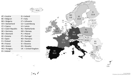 Furthermore, in 2017 about 2.75 million tons of mulch film were used in the agricultural sector [19], meaning that over just thirty years the world annual consumption of plastic films increased sixfold. Plasticulture is still very widespread in Europe. In the two-year period 2018–2019, plastic mulches accounted for 25.3% of the plastic sold for crop production and for 11.2% of the total plasticulture in Europe (Figure 3) [20]. The European countries (EU + 3) where the most plastic films were sold in 2018 were Spain (93,000 tons) and Italy (89,500 tons), followed by Germany and France (70,000 and 57,500 tons, respectively) (Figure 4) [20].
