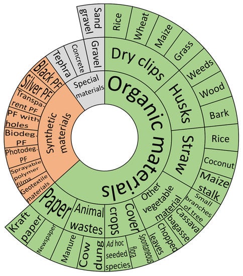 Mulches can be defined as materials that are applied or grow on the soil surface (the latter are the living mulches), in contrast to soil-incorporated materials [21]. They may provide many services to the soil: improvement of moisture content, reduction in soil compaction and erosion, mitigation of temperature excesses and defects, and improvement to plant establishment and growth [22,23]. Not to mention, organic and living mulches can improve soil nutrition, degrade pesticides, and reduce weed pressure [21,24,25,26,27]. Mulching materials can be classified into three types: organic materials (products of vegetable or animal origin), synthetic materials, and special materials (e.g., gravel); they can be used in combination, based on the specific aims [28]. Figure 5 shows the variety of mulches in relation to the material they are made of. There are a great number of organic mulches, and these include agricultural and industrial wastes, as well as living mulches. Synthetic mulches include several types of plastic films (Figure 5), even biodegradable and photodegradable ones [3], as well as spray-degradable polymer films (Figure 5), which are very versatile and easy to apply in the field.