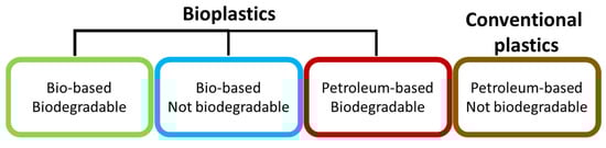 A polymer, the term for which derives from the Greek words πολυ- (poly) and μέρος (meros), literally meaning “having many parts”, is a substance composed of macromolecules. Polymers are present in nature, since they make up tissues of living organisms or perform important biochemical functions (e.g., cellulose and proteins), and some of these have important technological applications [35]. There are also polymers of partial natural origin that are synthesized from living tissues and chemically modified into “half-synthetic polymers”. Totally synthetic polymers, synthesized from low-molecular components, i.e., organic monomers [36], are mostly produced from fossil fuels such as oil and gas. Plastics are polymers that can be grouped into bioplastics and conventional plastics. The word “bioplastic”, however, can cause confusion, due to the meaning that everyone can attribute to the prefix “bio”. In fact, according to European Bioplastics [1], a plastic material is defined as a bioplastic (BP) if it is either bio-based (i.e., wholly or partially derived from biomass), biodegradable, or features both properties (Figure 6). Thus, contrary to common sense, some petroleum-based plastics can also be classified as bioplastics, provided they are biodegradable (Figure 6).
