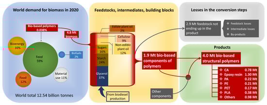 Diagram of the relationships between the biomass to produce bio-based polymers and bio-based structural polymers produced worldwide in 2020. Modified and adapted from Carus [47]. CA: cellulose acetate; PA: polyamide; PE: polyethylene; PET: polyethylene terephthalate; PLA: polylactic acid.