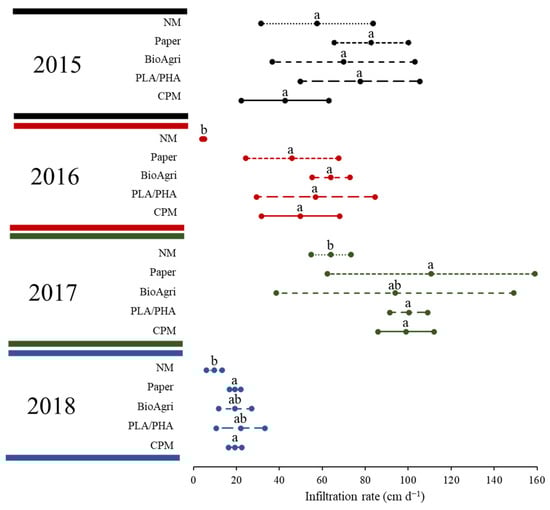 The geographical area where a mulching film is going to be used influences its duration, which is positively correlated to its weed-suppressive ability. Under semi-arid climates, for example, BdPMs generally have a shorter duration than in temperate zones, due to the high solar radiation intensity, humidity level, and soil temperature that stimulate the degradation processes [140]. For instance, in a three-year multi-location field experiment performed under semi-arid conditions in processing tomato, Cirujeda et al. [141] found that, averaged over locations and years, the tested BdPMs (black Mater-Bi©, black Biofilm© and black Enviroplast©) were capable of reducing weed biomass as much as PE.