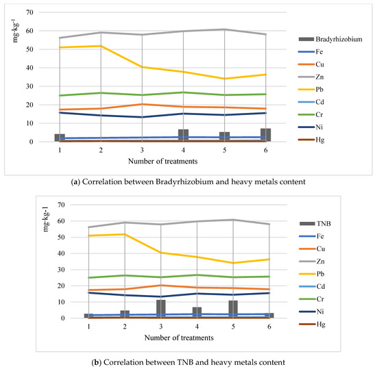 In our experiment, a significant effect of the analyzed heavy metals was the increase in the TNB (with the exception of chromium), including Bradyrhizobium. The number of Bradyrhizobium showed sensitivity to lead and mercury. A higher lead and mercury content decreased their number (Figure 2a). In the case of the total number of bacteria, a decrease in the bacteria numbers was found only in correlation with mercury (Figure 2b). Dependencies between other metals from the group of trace elements indicate a difference in the impact on bacterial metabolism (Table 4 and Table 5).