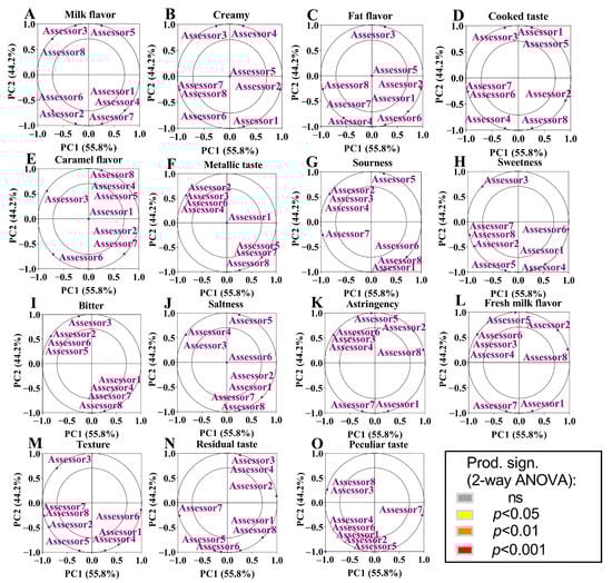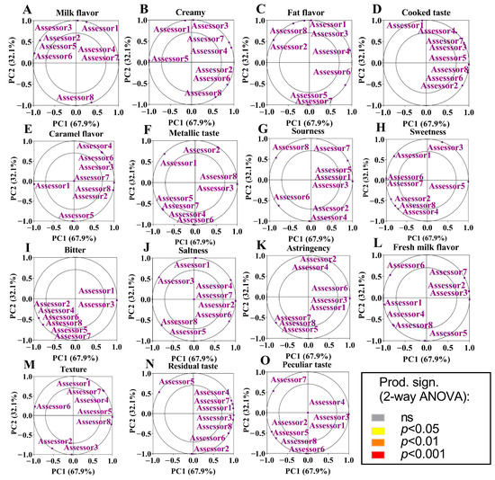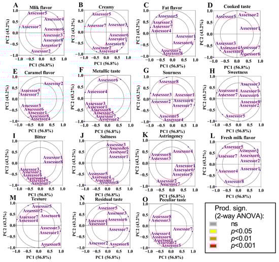 Checking the consistency of sensory evaluation group using Tucker-1 analysis for milk samples stored for 72 h. There were eight assessors and 15 flavors in total. (A) Milk flavor; (B) Creamy; (C) Fat flavor; (D) Cooked taste; (E) Caramel flavor; (F) Metallic taste; (G) Sourness; (H) Sweetness; (I) Bitter; (J) Saltness; (K) Astringency; (L) Fresh milk flavor; (M) Texture; (N) Residual taste; (O) Peculiar taste. A p < 0.05 was considered statistically significant.