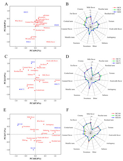 Principal component Analysis (PCA) diagram and spider web diagram of pasteurized milk. MC, 0-bar pressure-homogenized pasteurized milk; ML, 150-bar pressure-homogenized pasteurized milk; and MH, 300-bar pressure-homogenized pasteurized milk. PCA of 8-h samples (A). Cobweb plot of 8-h sample sensory attributes (B). PCA of 72-h samples (C). Cobweb plot of 72-h sample sensory attributes (D). PCA of 168-h samples (E). Cobweb plot of 168-h sample sensory attributes (F).