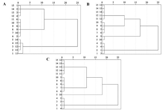 Cluster analysis (CA) of pasteurized milk. Labels 1, 2, 3, 4, and 5 represent the control sample milk. Labels 6, 7, 8, 9, and 10 represent the homogenized sample milk at 150-bar pressure. Labels 11, 12, 13, 14, and 15 represent the homogenized sample milk at 300-bar pressure. Cluster analysis (CA) of 8-h pasteurized milk (A). CA of 72 h pasteurized milk (B). CA of 168-h pasteurized milk (C).