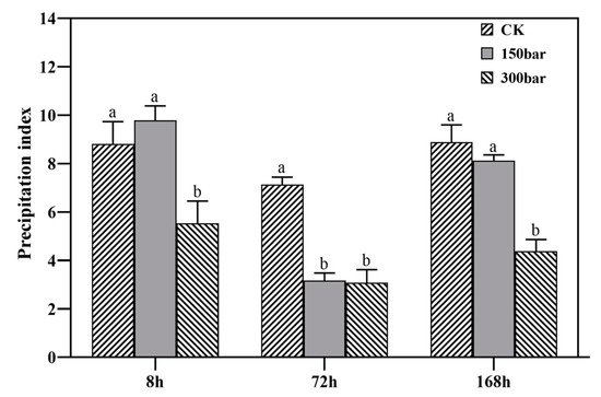 Milk is usually homogenized and heat-treated to reduce the size of fat globules and microbial load, increasing the stability of milk [46,47]. The high milk fat content and the large diameter of the fat globules make it easy for instability issues such as fat floating to occur during storage. To minimize these phenomena during production, the homogenization pressure needs to be strictly controlled. Homogenization pressure can make the fat globules smaller and slow down the fat floating, thus improving milk stability [48]. When the homogenization pressure reaches a certain level, the energy consumption increases sharply, and the homogenization efficiency increases slowly [48]. Due to the smaller particle size of the fat globules with increased homogenization pressure, the surface area increases. Thus, the thickness, strength, and product stability of the new interface film are reduced [49]. In Figure 6, the stability of pasteurized milk treated with different ho-mogenization pressures for three time periods (8, 72, and 168 h). The stability of pasteurized milk on the last day of shelf life at 150-bar homogenizing pressure decreased with increasing storage time in Figure 6. There was little difference between the stability of pasteurized milk stored at 300-bar homogenizing pressure for 72 h and 168 h. The stability of pasteurized milk at different homogenizing pressures for 8 h was good, but the shelf life was short. Therefore, pasteurized milk with a shelf life of 72 h at a homogenization pressure of 150 bar was more stable. By homogenizing milk, the fat globules become smaller, triglycerides are released, and the surface of the fat film becomes rough and uneven, which leads to better interaction between fat and casein and ultimately increases stability [50].