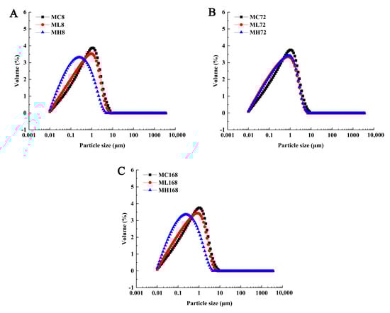 Milk is an emulsion discontinuously dispersed in water, where water is the continuous phase and proteins and fats are the dispersed phases. The particle size and particle size distribution of the emulsion can affect the solubility, stability, and organoleptic properties of milk proteins. The particle sizes of the samples stored for 8, 72, and 168 h are shown in Figure 7. The particle size of milk was mainly 0.01–9 μm, and the maximum volume peak was 1.5 μm. The particle size distribution of milk with different storage times was similar. With the increase in homogenization pressure, the position of volume peak gradually moved to the left; particles smaller than 0.5 μm increased, and those larger than 0.5 μm decreased. Figure 7 show the decrease and increase in large and small particles, respectively. The reason may be that the oxidative breakdown of fat in cow’s milk leads to a decrease in large particles and an increase in small particles. The increase in small particle size is conducive to the dispersion of milk particles and improves the emulsion solubility. The presence of particles with excessive particle size in the system increases the instability of milk [6]. As can be seen from Figure 7A,B, the difference in particle size of pasteurized milk samples stored for 8 and 72 h at homogenization pressures of 0 and 150 bar is not significant, and the maximum volume peak of the particle size of these two samples slowly moved to the left. The particle size of sample milk with a different shelf life under 300-bar homogenization pressure was significantly smaller than that under the other two homogenization pressures.