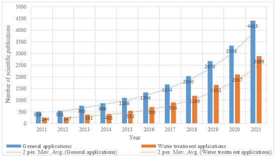Aerogels are three-dimensional (3D) nano-porous structures of non-fluid colloidal inter-connected polymeric or non-polymeric networks [1]. Aerogels exhibit several unique properties, such as ultra-low density, high porosity and extremely high surface area, which make them suitable in water treatment applications [2,3]. They are normally fabricated from silica through the conventional sol–gel method followed by a drying method such as ambient pressure drying, supercritical drying or freeze drying [4]. More recently, other forms of aerogels have been developed, including carbon aerogels, biopolymeric aerogels, synthetic polymers aerogels and metal aerogels, etc. The fabrication approaches have been also widely developed to become more facile, eco-friendly and unexpensive. Over the past few years, many applications have been identified for aerogels that suit their unique properties, including: thermal and non-thermal insulation [5], absorption [6], packaging [7], supercapacitors [8], catalysts [9], energy storage [10], filtration [11], conduction [12], sensing [13], and the cleaning and adsorption of wastes [14]. Hybrid aerogels were the key to enhance the properties and performance of the pure aerogel, as integration of new substances into a pure aerogel both significantly enhance and gave the material new properties for use in wider applications [15]. The past ten years have witnessed accelerated and widespread use of different aerogels in several applications, including water treatment applications. Figure 1 shows the accelerated grow of scientific publications related to aerogels in general and water treatment applications.