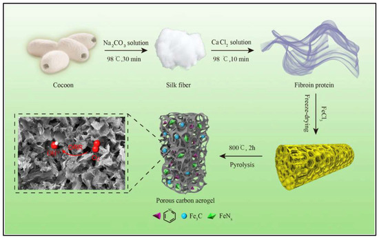 Several polymeric materials can easily form gels when they are suspended in water, such as carrageenan, gelatine, and starch, etc., but others, such as cellulose and synthetic polymers require a cross-linker for this purpose [30]. However, aerogels can be simply prepared from both types of materials, with or without the formation of a wet-gel of the material. The shape of particles can be preservative and fixed during the drying phase either by the formation of wet-gel or by freezing of the suspension. The fabrication of an aerogel can be initiated by dissolving or dispersing the precursor material/s in distilled water or any other liquid solvent. The homogenization of precursor materials are required for a non-solvable material to achieve homogeneous suspension; the solution then requires some time for the aging process to form a wet-gel [71]. The precursor particles are linked together during the aging process, forming a viscous semi-solid material known as wet-gel. This material is formed by the network of precursor/s surrounded by the solvent. The next step is to remove the solvent without shrinking or disturbing the structure of that network. In order to achieve this, the wet-gel is frozen to keep the structure integrity intact, and then the frozen material is either freeze-dried or supercritical-dried. Freezing of the wet-gel will result in removing the liquid from the system, leaving the precursor network, which appears as a porous 3D material known as aerogel [72]. Li et al. [73] fabricated cocoon-based carbon aerogel by pyrolyzing the initially prepared aerogel at 800 °C for two hours. The authors were able to achieve a nano-porous structure with excellent catalytic activity for their carbon aerogel (Figure 2). The porosity, pore size and volume of the aerogel can be determined by the type and concentration of the precursor material/s. The fabrication technique and the conditions of preparation also highly affect the physical, chemical, and mechanical properties of the aerogels.