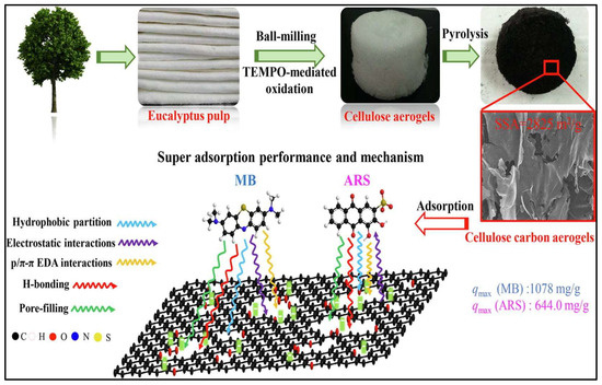 Illustration of cellulose carbon aerogel for enhanced organic dyes adsorption from an aqueous solution. Adapted from Huang et al. [94].