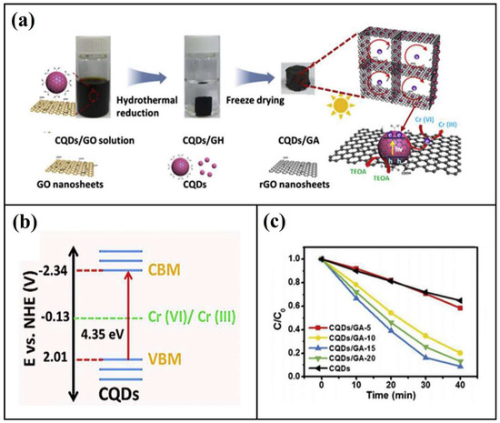 Carbon quantum dot graphene nano-aerogel: (a) the fabrication process; (b) band structure of carbon quantum dot; and (c) photocatalytic performance of chromium (VI) reduction during UV–Vis light irradiation. Adapted with permission from Wang et al. [106] and Lee et al. [86].