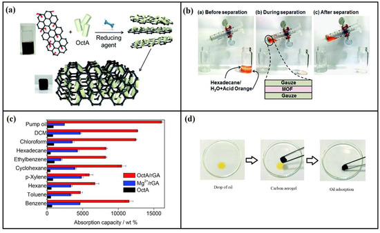 Nano-structured aerogels have been also utilized in oil/water separation due to their facile, rapid, selectivity, reusability, and recyclability advantages. Different forms of aerogels possess different adsorption capacities; Qu and co-workers displayed the ability of their prepared N-doped graphene framework compared with several previous works [112]. The authors reported that their aerogel was able to adsorb oil up to 200–600 times its weight, compared with previous works; conventional graphene aerogel (10–37 times) [113], carbon nanofiber aerogels (51–139 times) [114] and carbon-nanotube aerogel (80–180 times) [115]. Bi and co-workers developed an easy approach for developing cost effective nano-structured carbon micro-belt aerogels using waste papers as a precursor material [116]. The authors reported superior properties for their aerogel including hydrophobicity, low density and a high specific surface area, which was able to adsorb organic liquids including pump oil; (up to 188 g/g), and chloroform (up to 151 g/g). Using such an aerogel opens many doors for largescale production of advanced adsorption materials, and the same authors stated that their aerogel can be regenerated and reused many times without any significant decrease in sorption performance by distillation or squeezing [116]. A mesoporous silica aerogel membrane was recently fabricated by Wang and co-workers for oil adsorption applications [117]. As an inorganic material, the aerogel exhibited high hydrophobicity, and was able to adsorb up to 99.9% of surfactant water-in-oil. A carbon nanotube aerogel was also used for oil adsorption due to its oil absorption capacity and excellent mechanical properties [118,119]. In one study done by Gui and co-workers, the authors reported an oil absorption capacity of up to 180 times for a carbon nanotube aerogel [115]. Despite the excellent performance of this aerogel, it is still associated with high production costs, which may not be applicable in at large-scale levels. To solve this issue, several studies have used biopolymers as a sustainable precursor material for aerogels. Cervin and co-workers developed a hydrophobic cellulose-based aerogel and reported encouraging performance in the separation of oil from water [120]. Eom et al. [121] fabricated an octylamine reduced graphene oxide aerogel able to effectively separate oil from water (Figure 8). The authors also modified Mg2(dobpdc) by using monoamines of several alkyl chain lengths, which led to long-term stabilization of the mixture and facile fine-tuning of its wettability. The same authors investigated the potential of their aerogel in absorbing other organic solvents and reported the promising potential of their materials (Figure 8c).