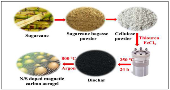 The fabrication of N/S doped carbon aerogel by using sugarcane bagasse for bisphenol-A absorption. Adapted from Ahamad et al. [125].