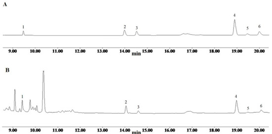 The chromatogram of reference substances (A) and Paris polyphylla var. yunnanensis (B). 1. Pseudoprotodioscin; 2. Polyphyllin VII; 3. Polyphyllin H; 4. Polyphyllin II; 5. Dioscin; 6. Polyphyllin I.