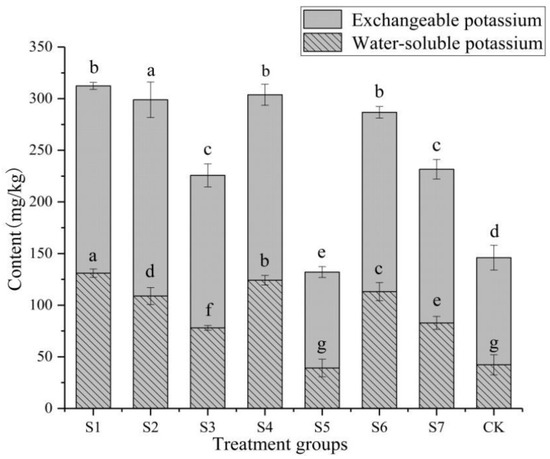 In all groups, the content of exchangeable K was higher than that of water-soluble K, and the content of exchangeable K and water-soluble K was significantly different between groups (p < 0.05) (Figure 2). Except for the S5 (inoculation with both B. thuringiensis and B. polymyxa) treatment, the content of available K in all other treatment was higher than that in the CK (inoculation without any KSB). The content of available K in S1 (inoculation with B. thuringiensis) was the highest among all treatment, which was 312.379 mg/kg, an increase of 113.90% compared with the CK. The change trend of exchangeable K and water-soluble K content was consistent with the change trend of available K content. The content of exchangeable K in S2 (inoculation with P. amylolyticus) was the highest, which was 190.084 mg/kg, an increase of 83.20% compared with the CK. The contents of available K, water-soluble K, and exchangeable K in S5 were lower than those in the CK, with a decrease of 9.5%, 7.3%, and 10.4%, respectively. In general, the inoculation of KSB significantly increased the content of available K in the soil, which is beneficial to the absorption and utilization of K by plants, and improved the plant availability of soil K.