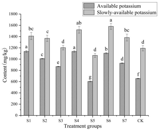 The contents of available K and slowly-available K in the rhizosphere soil of P. polyphylla var. yunnanensis were affected by different KSB, and there was a significant difference between the treatments (p < 0.05) (Figure 3). Except for the S5 treatment, the contents of available K and slowly-available K in the rhizosphere soil of P. polyphylla var. yunnanensis in all other treatment were significantly higher than those in the CK. The slow-acting K content of S6 (inoculation with both P. amylolyticus and B. polymyxa) in all treatments was the highest, 1581.26 mg/kg, an increase of 32.60% compared with the CK. The content of available K was the highest in S1, 1136.76 mg/kg, an increase of 73.5% compared with the CK. The contents of available K and slow-acting K in S5 were lower than those in the CK, with a decrease of 7.80% and 10.60%, respectively. In general, the inoculation of KSB had a promoting effect on the content of available K and slow-acting K in the soil.