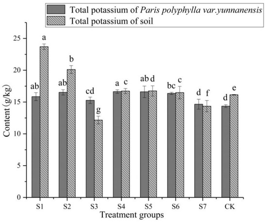 The absorption of K in P. polyphylla var. yunnanensis was affected by inoculation of KSB (Figure 4). Among all treatment, the total K content of P. polyphylla var. yunnanensis in S1, S2, S4 (inoculation with both B. thuringiensis and P. amylolyticus), S5, and S6 was higher than that in the CK, ranging from 16.486 g/kg to 23.707 g/kg. The total K content of P. polyphylla var. yunnanensis in S1 was the highest, which was 46.8% higher than that in the CK. The total K content of soil in all experimental groups was 14.358 g/kg (CK)–16.642 g/kg (S4), and the difference between groups was smaller than the total K content in the rhizome of P. polyphylla var. yunnanensis.