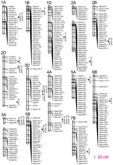 - An, D.; Su, J.; Liu, Q.; Zhu, Y.-G.; Tong, Y.; Li, J.; Jing, R.; Li, B.; Li, Z. Mapping QTLs for nitrogen uptake in relation to the early growth of wheat (Triticum aestivum L.). Plant Soil 2006, 284, 73–84. [Google Scholar] [CrossRef]