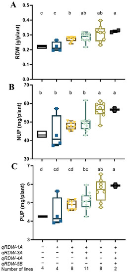 The RDW (A), NUP (B), and PUP (C) of lines with varying combinations of RDW QTLs in the “Xiaoyan 54 × Jing 411” RIL population. The values of six groups of lines were compared, each group harbors null, one, two, three, or four favorable alleles of RDW QTLs. “+” represents a favorable allele, while “−” represents an unfavorable allele. The median is indicated by the solid horizontal line. Vertical lines represent the range. Statistical differences are indicated by different letters above the boxes. Boxes that do not possess the same letter(s) mean significance at p < 0.05 level (Duncan’s multiple range test).
