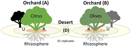 A total of 22 composite samples were collected (i.e., 11 composite samples collected twice) in July at average temperatures of 34 °C during the daytime. Samples were obtained from newly reclaimed orchards cultivated with citrus and olives. Two composite sample types (i.e., rhizosphere and uncultivated) for each plant species were collected from each orchard located near the Cairo-Alexandria Road (30°16′5″ N and 30°39′38″ E), along with triplicate composite samples from a nearby desert area (30°15′19″ N and 30°38′38″ E; Figure S1). For orchard composite samples, for each tree species, 5 random soil samples were collected and mixed from the root rhizosphere area of healthy trees at least 1 m distance apart at a depth of 5–10 cm from the surface alongside the tree trunk (Rhizosphere samples); an additional 5 random samples were mixed from the area between two trees of the same type at the same depth (uncultivated samples). Approximately 50 g of each composite soil sample was stored at 4 °C in autoclaved plastic zip-lock bags until processing [] (Table 1, Figure 1). Within a week after the last sample was collected, samples were processed simultaneously.