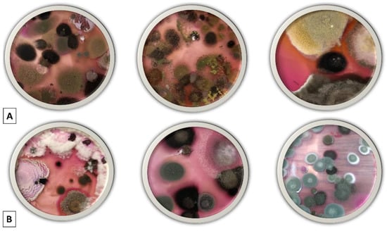 The results of the screened soil samples in the current study were a total of 272 fungal isolates obtained during the isolation from 22 soil samples cultivated on DRBC media after 3–7 days at 25 °C. An example of the cultivated plates is shown in Figure 2. To detect the fungal community occurrence relating to the colony forming unit CFU/g the average fungal abundance was found to be around 103 from orchards and 102 from the desert (Table 2).