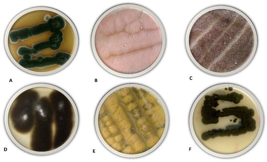 Fungal isolation was carried out by preparing a decimal dilution from the soil samples. One gram of the soil sample was suspended in 10 mL of physiological solution to make a serial dilution up to 5-fold. 1 mL of each suspension/dilution was inoculated into Petri dishes containing Dichloran Rose Bengal Chloramphenicol (DRBC) agar medium (#CM0727, Oxoid, Lenexa, KS, USA) and incubated at 25 °C for 5–10 days [,]. All obtained morphotypes were counted to detect colony forming unit (CFU; Table 2). The morphological observation for the screened fungi in the current study was performed on Potato Dextrose Agar (PDA; #1022, Condalab, Madrid, Spain) and incubated at 25 °C for 7 days [] incubated at 25 °C for fungal single colonies differentiation and then subjected to morphological and molecular identification.