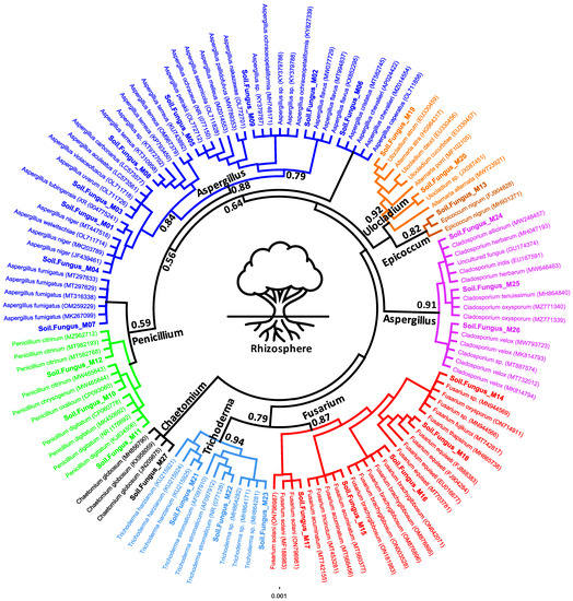 The phylogenetic tree for the fungal isolates species from the current study includes similar internal transcribed spacer data recorded for each species in the NCBI database. Different clusters were named by genus name, and samples were coded as “Soil.Fungus_M#” and serialized by number in the same order as Table 3.