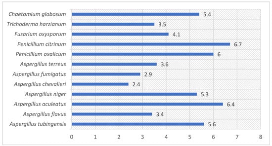 Phytohormones such as indole acetic acid (IAA), which are plant growth promoters, are key factors in crop growth promotion. This usually occurs in microorganisms and is commonly established in the rhizosphere. Therefore, the inoculation of plants by targeting microorganisms at higher concentrations benefits overall crop production [,]. In the current study, eleven fungal isolates tested positive for their ability to produce IAA in vitro, which can be used in the future for the improvement of plant growth; the highest amount of production was assigned to Aspergillus tubingensis, A. fumigatus, and A. flavus, followed by Trichoderma harzianum, Penicillium oxalicum, P. citrinum, and Chaetomium globosum. The ability of endophytic filamentous fungi to produce IAA in vitro has also been described in non-agricultural plants, such as Epicoccum nigrum [], Aspergillus japonicus, and A. niger [,] to improve plant growth parameters, as well as from cereals, like T. harzianum [,] and F. oxysporum in maize []. In addition, Pseudomonas syringae, which causes bacterial speck disease, was suppressed by Aspergillus terreus isolated from tomato plants that produced IAA [].