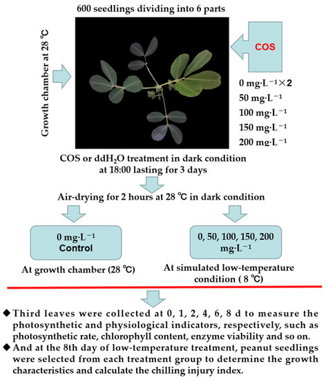 In June 2020, the low-temperature treatment (8 °C) was conducted in a low-temperature-simulated growth room in the College of Agriculture/Peony College, Henan University of Science and Technology, Luoyang (34.6027° N, 112.4149° E), Henan Province, China. A schematic diagram of the simulated low-temperature experimental design is shown in Figure 1. Six hundred peanut seedlings were divided into six aliquots and grown at a temperature of 28 °C and 16 h/8 h (light/dark) until the fourth leaf was fully unfolded. Of them, four seedlings were sprayed with 50, 100, 150, and 200 mg L−1 COS for 3 consecutive days each time until the solution flowed from the leaves. Moreover, the control and 0 mg L−1 COS groups, were sprayed with double-distilled water (ddH2O). After spraying the peanut seedlings with COS or ddH2O, they were air dried for 2 h in the dark. Then, the COS-treated groups (0, 50, 100, 150, and 200 mg·L−1) were subjected to 8 °C, and the control group was subjected to 28 °C. The third leaves down from the top of the seedlings were collected at 0, 2, 4, 6, and 8 days, respectively, and they were used to determine the contents of malondialdehyde (MDA), hydrogen peroxide (H2O2), superoxide anion (O2−), soluble sugars (SS), soluble protein (SP), proline (Pro), total polyphenols (TP), and the activities of superoxide dismutase (SOD), peroxidase (POD), catalase (CAT), and polyphenol oxidase (PPO). At the end of the cold injury stress (8 DAT), the growth characteristics were measured, and the cold damage index was calculated to evaluated the degree of injury [32].