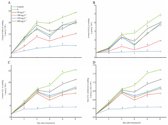 The levels of MDA in the treated seedling leaves were significantly higher than those in the control group (28 °C), and they showed a trend of increasing first, decreasing later, and then increasing again with prolonged exposure to the low temperature (8 °C) (Figure 2A). After the application of exogenous COS, the trend of the MDA content in the seedling leaves remained unchanged, however, the content was significantly decreased, especially in the treatment conditions with a chitooligosaccharides concentration of 100 mg·L−1, which was closest to that of the control compared to those of other concentrations used in the test. At days 1, 2, 4, 6, and 8 of cold stress induction, the MDA contents treated with 100 mg·L−1 chitooligosaccharides were 45.31%, 41.11%, 51.95%, 54.59%, and 47.27% less than those that were only treated with the low temperature (0 mg·L−1), respectively. Next, all of the contents of H2O2, O2−, and the rate of O2− production in the seedlings were increased with prolonged exposure to the cold environment, but the chitooligosaccharides all showed a trend of increasing first, then decreasing, and then increasing again, and this most significantly decreased the contents of H2O2, O2− and the rate of O2− production, especially in the treatment conditions with a chitooligosaccharides concentration of 100 mg·L−1 (Figure 2B–D). Additionally, at days 1, 2, 4, 6, and 8 of cold stress induction, the H2O2 contents decreased by 33.13%, 51.97%, 68.41%, 66.69%, and 60.30%, the O2− contents decreased by 16.57%, 14.19%, 46.51%, 48.61%, and 49.55%, and the rates of O2− production decreased by 16.55%, 13.89%, 46.36%, 48.68%, and 49.49%, respectively. These results indicated that exogenous 100 mg·L−1 oligosaccharides alleviated the ROS formation caused by cold stress and contributed to cold tolerance in the peanut seedlings (Figure 2).